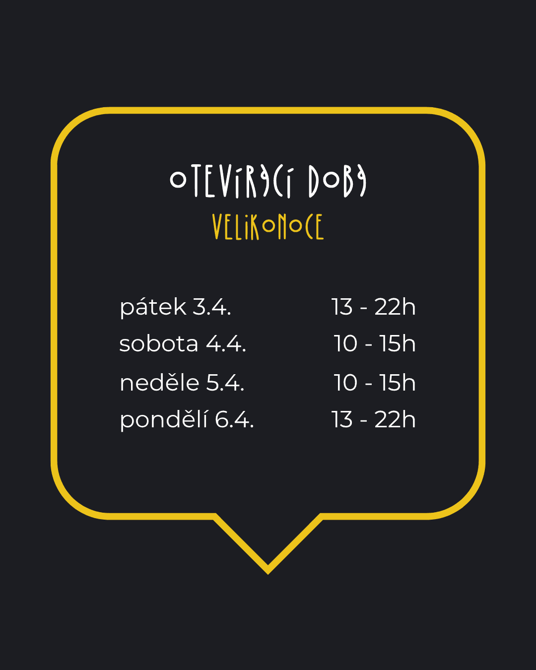 pátek 3.4. 13 – 22h sobota 4.4. 10 – 15h neděle 5.4. 10 – 15h pondělí 6.4. 13 – 22h